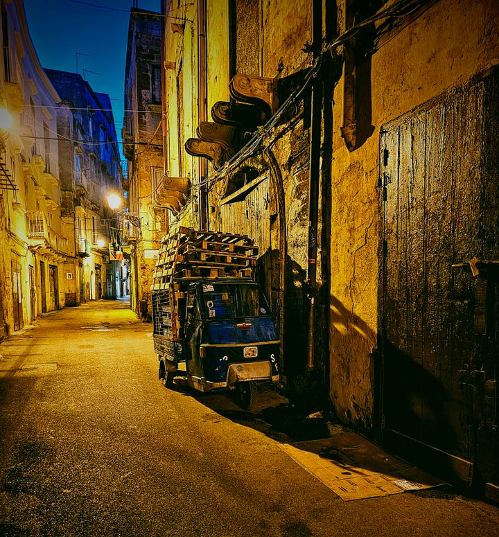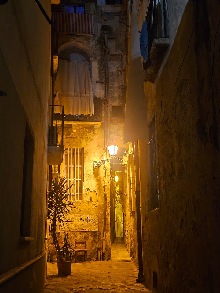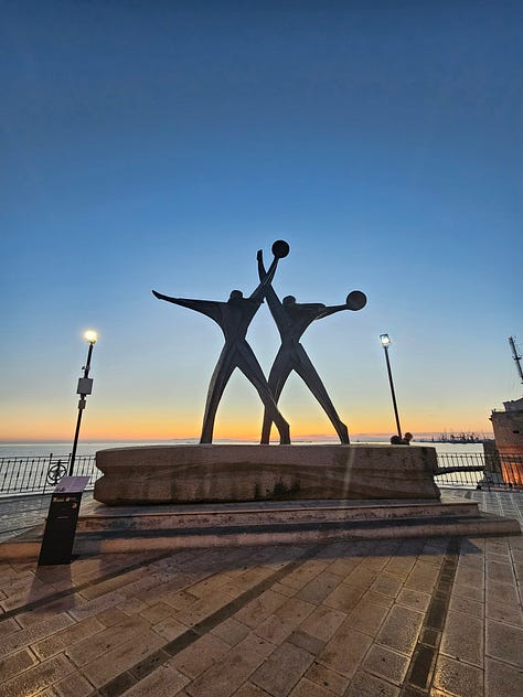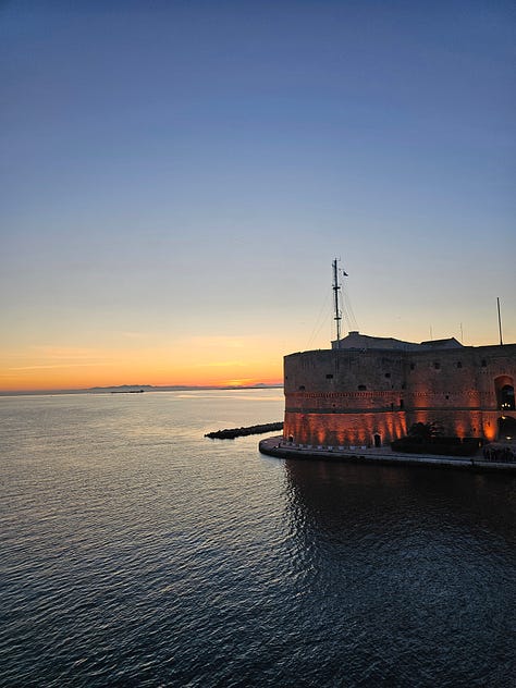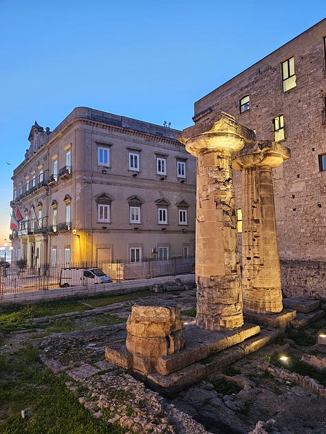 And so, centuries later, we are very fortunate to be close to one of the largest Museums with the very a well-preserved and curated collection of Greek artifacts and archeological sites, centred around the necropolis (city of the dead), where lavish burials took place, each telling a story about the person, their achievements, life-style, and life in those days. A must-visit. I learnt a lot …… (and not just about ancient shenanigans). The old town is ancient and intriguing. Apart from its history, Taranto is renowned for its sea food, mussels especially and in 2026 the Mediterranean Games will be held there. Fingers crossed, these will fire up the incentive to give it a both a good spruce up and increase its ranking in appreciation and study of human history. Unfortunately, Taranto, like other cities and towns in Puglia has been left to its own devices. Due to the presence of powers that be, including those of organised crime and deep deep corruption, the righteous and those of good will, battle continuously to uphold their city’s good name. What a shame.