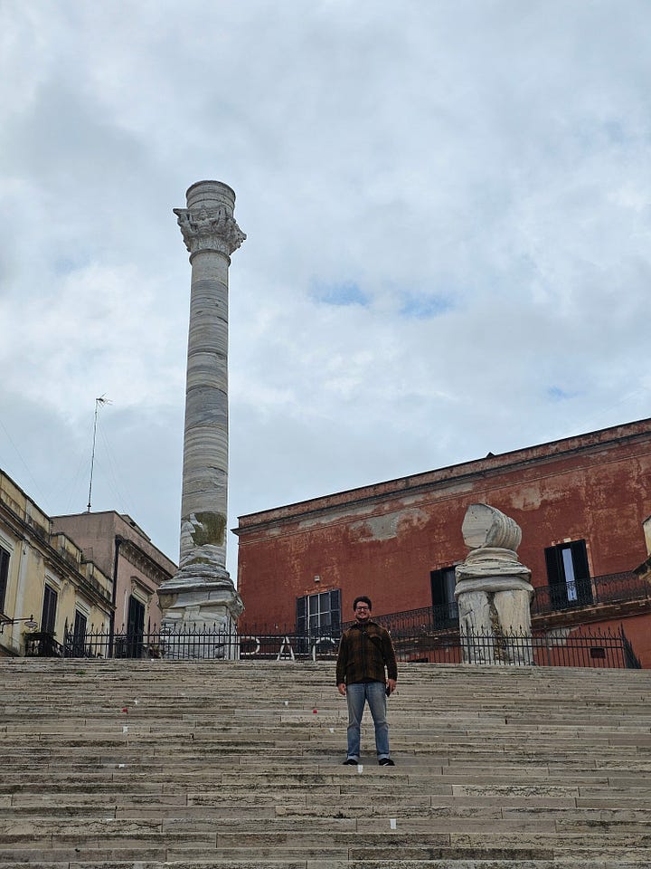 On the other side of the Puglian peninsula, this time the Adriatic sea, lies Brindisi which we also visited with Gianni. Again we hadn’t yet appreciated much of what it offers and its history. Brindisi is the end point of the Via Appia, marked by two columns, which the Romans built stretching all the way from Rome, across fields, mountains, valleys and countryside to facilitate the transfer of armies and goods towards the East. Brindisi is the port from which the galleons carried men, armies, goods and trade to conquer their Eastern colonies. Brindisi remains the port where one can catch a ferry to Croatia, Albania or Greece. Some of you will have travelled this ancient route to the orient on your great OE!